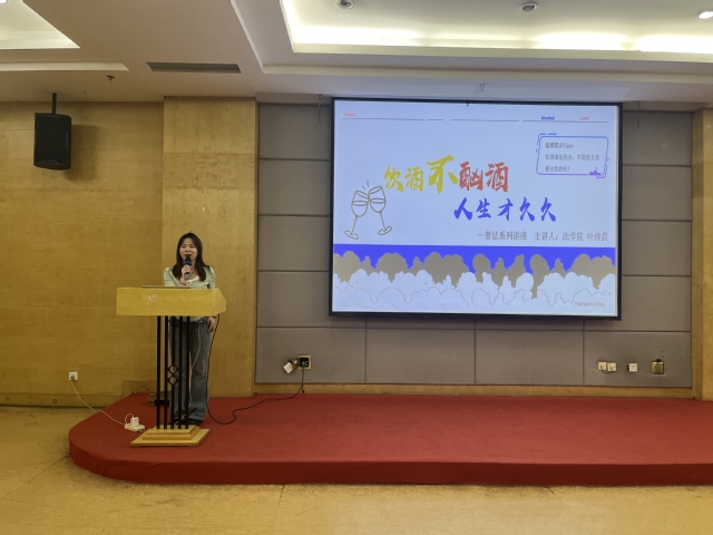 叶梓晨同学普法的主要内容是“饮酒不酗酒,人生才久久”。她先向同学们介绍了何为酗酒,饮酒与酗酒的区别以及酗酒的危害。接着用一段真实的案例视频向同学们强调了酒精不能脱罪,以及酗酒后易发生的犯法类型。最后从酒驾和醉驾入刑两点为切入口,向大家强调了酗酒后犯法的严重后果。