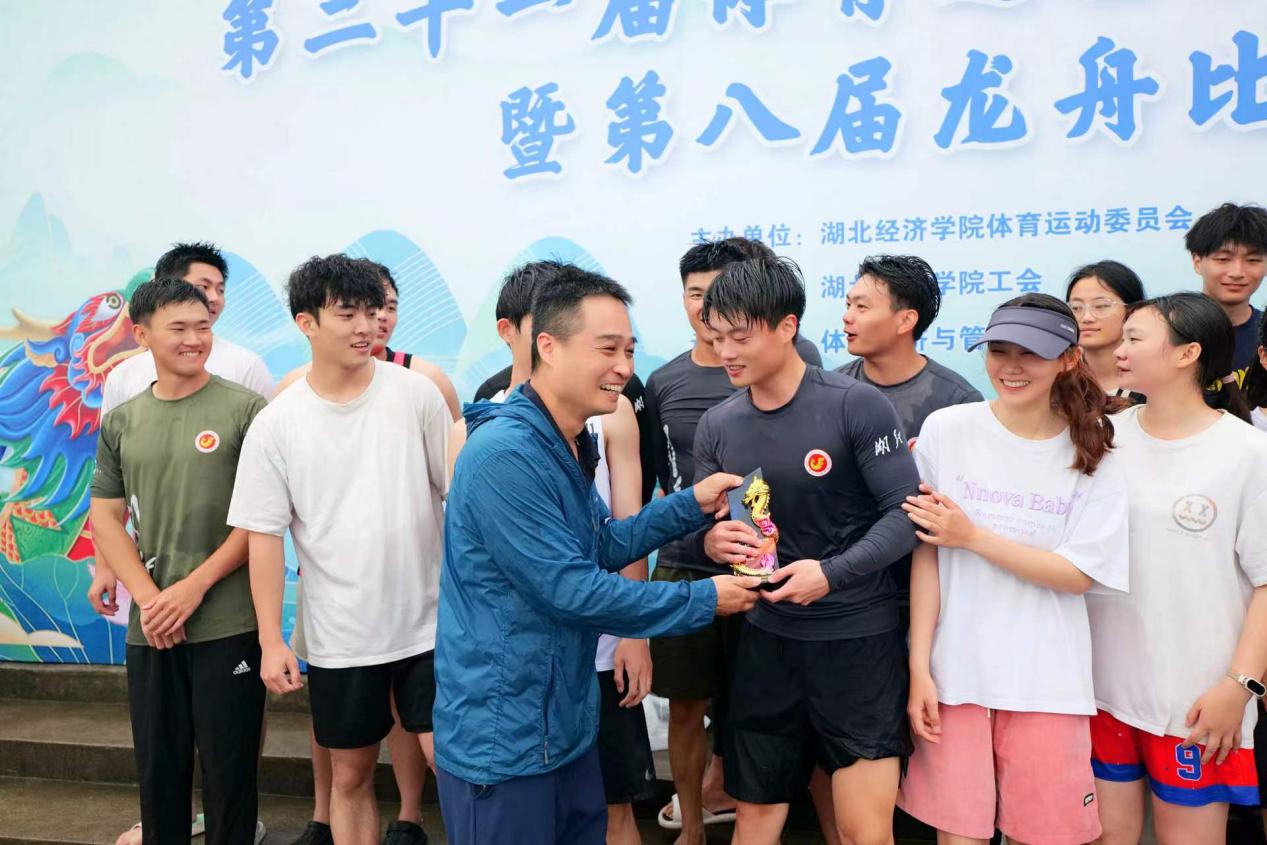 经过激烈角逐,休体大三联队划出龙舟大赛全场最好成绩夺得桂冠,副经理张诚为其颁发冠军奖杯。休闲体育2242代表队在比赛中上演逆转大戏以0.38秒微弱优势绝杀休闲体育2241代表队。