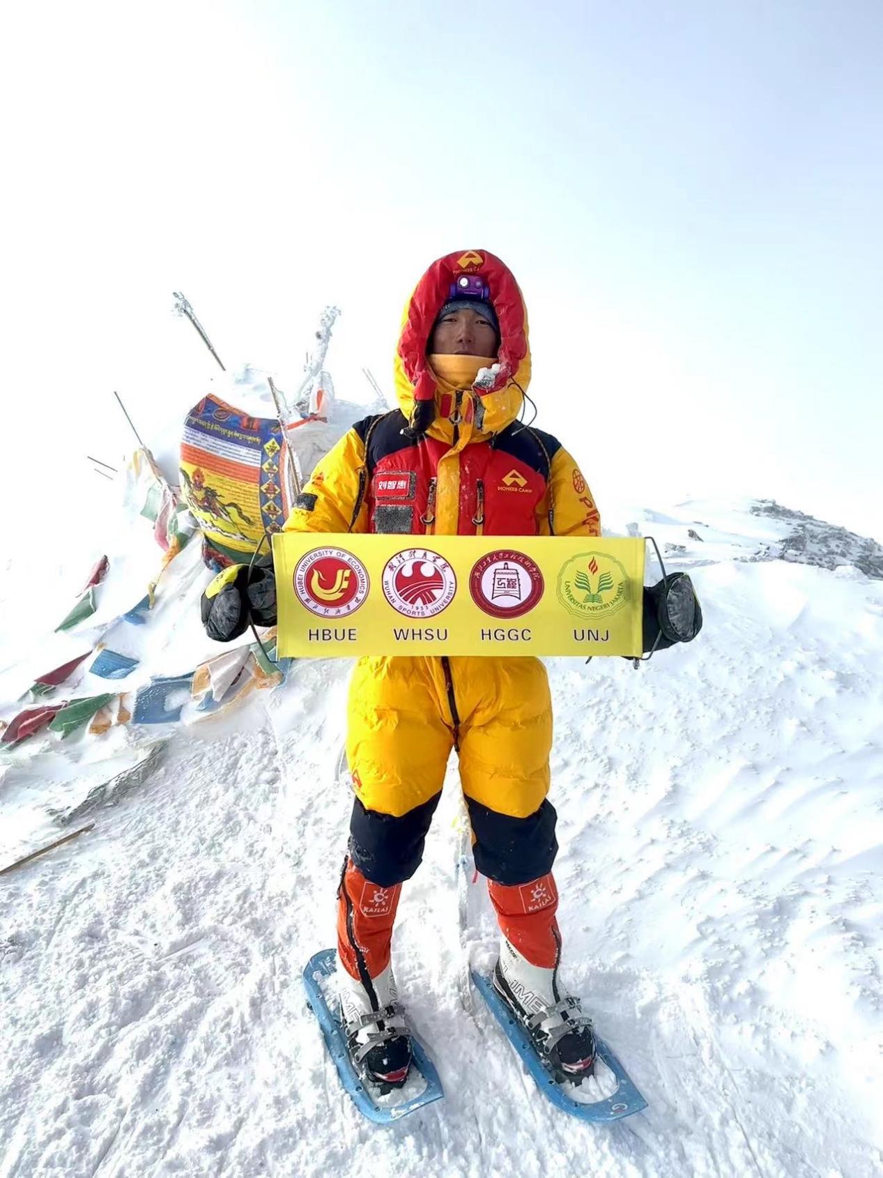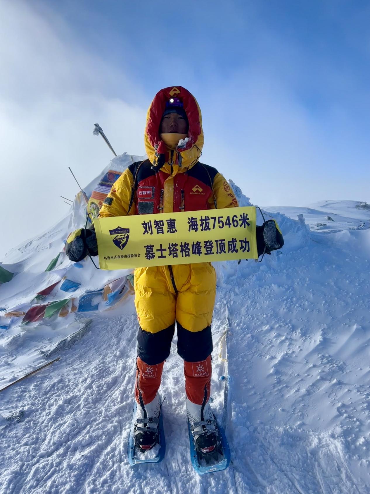 刘智惠克服了高原反应带来的不适和复杂多变的天气条件以及陡峭的登山路线等等困难总共历时21天,经历2次冲顶,7月21日8点28分,他终于登上了海拔7546米的慕士塔格峰顶。在标志点,他拿出了贴身携带的校徽横幅合影,他把自己最美的身影和对母校最深沉的热爱和祝福,烙印在了慕士塔格峰的山巅之上。