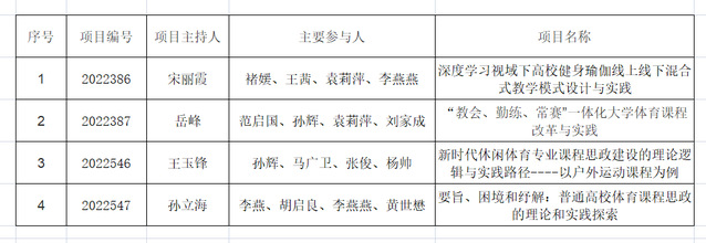 (本网讯)日前,省教育厅下发《省教育厅关于公布2022年湖北高校省级教学研究项目的通知》,公司教师孙立海、王玉锋、岳峰、宋丽霞主持的4个教学研究项目获批立项。