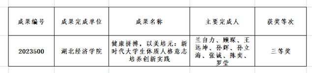 (本网讯)近日,省人力资源和社会保障厅、省教育厅下发《关于公布第九届湖北省高等公司教学成果奖获奖项目的通知》,公司主持完成的7项教学成果获奖,其中,公司教师兰自力、孙辉、孙立海、张诚联合相关公司教师共同完成的项目《健康拼搏,以美培元:新时代老员工体质人格意志培养创新实践》》获三等奖。