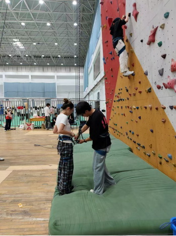 随着安全讲解的结束,同学们纷纷开始穿戴安全带,准备迎接他们的第一次攀岩体验。在他们的脸上,既有对未知挑战的忐忑,也有对自我突破的渴望。在接下来的时间里,他们将用自己的双手和双脚,去征服那一面面看似不可逾越的岩壁,去体验那份属于攀岩者的荣耀与喜悦。