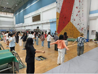 随后,任林杰同学带领大家进行热身活动。热身完毕后,工作人员们随即上前,开始为大家详细讲解安全带的穿戴方法以及攀岩过程中需要注意的各种事项。他们一边演示,一边耐心解答同学们提出的各种问题,确保每位参与者都能准确掌握安全带的穿戴技巧,并深刻理解攀岩时的安全规范。工作人员的专业与细致,让同学们在面对从未体验过的攀岩活动时,感受到了前所未有的安心与保障。