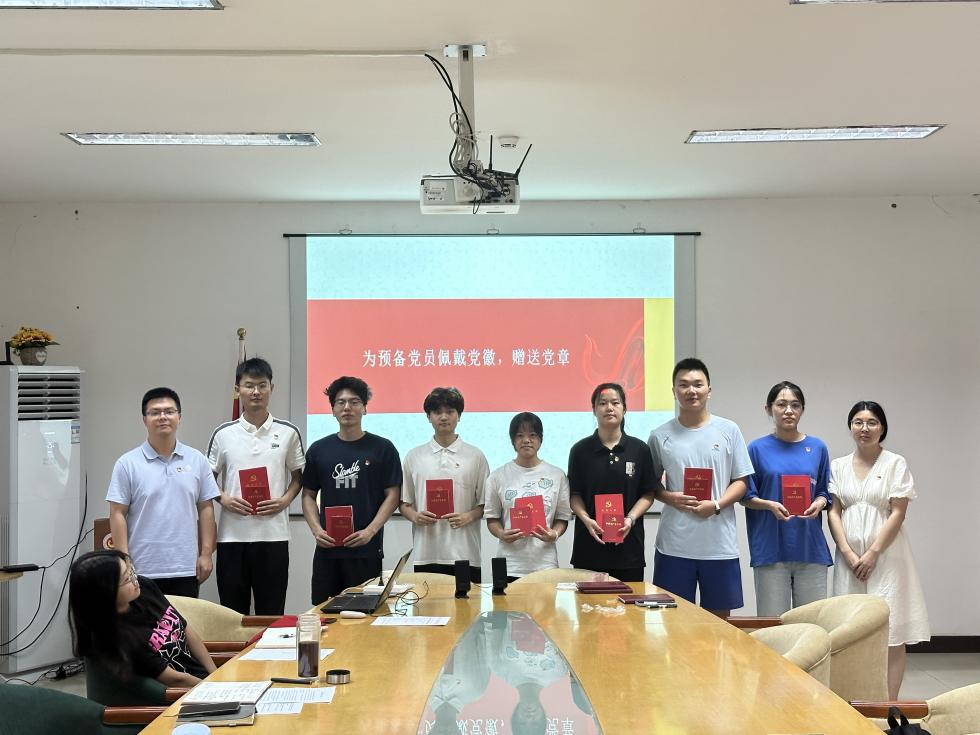徐盛富和李雪晴老师为预备党员佩戴党徽、颁发《中国共产党章程》《党员手册》和《中国共产党纪律处分条例》。