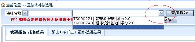 重修采取网上注册的形式,员工从教务处网站登录个人教务管理系统,在“网上选课”—“重修或补修选课”选择“查询课程”旁边的下拉框选中