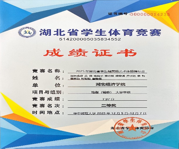 陈馨嬨、蔡卓含、陈淑娴等八名同学所在的一队,斩获“健身操舞类大学甲组瑜伽(徒手)”项目第一名,荣获一等奖;邹远雅欣、黄佳等十名同学所在的二队则在“健身操舞类大学甲组瑜伽(辅具)”项目中取得第三名,荣获二等奖。