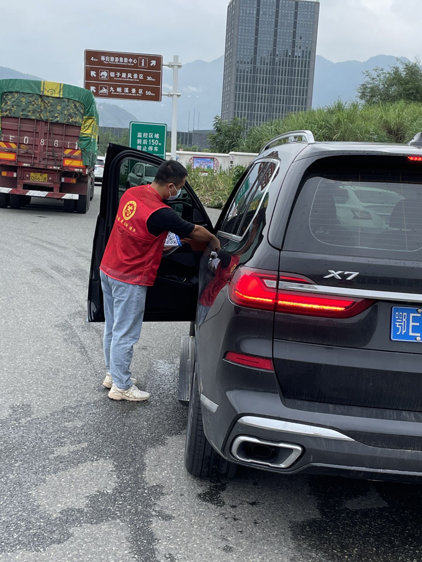 周浩然同学在县高速公路的出入口登记中高风险地区进县人员以及进县的车辆游客扫码