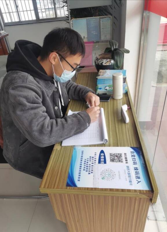 刘奥玮同学在社区进行体温测量和来访人员登记工作