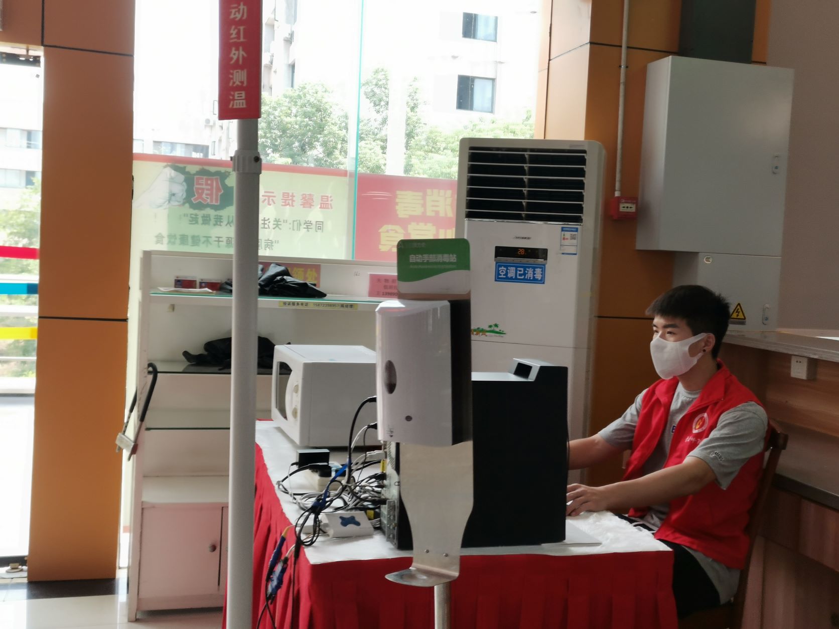 公司志愿者在三清园食堂进行体温测量工作