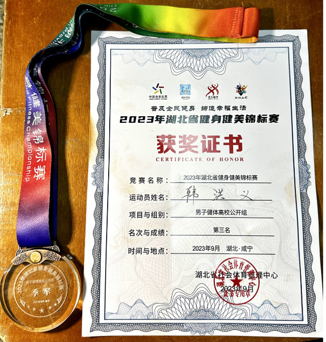 (本网讯)由湖北省体育局、湖北省社会体育管理中心主办的2023年湖北省健身健美锦标于2023年9月15日-17日在湖北咸宁举行。公司休闲体育专业健身健美专项员工韩洪义获得“男子健体高校公开组”项目第三名。