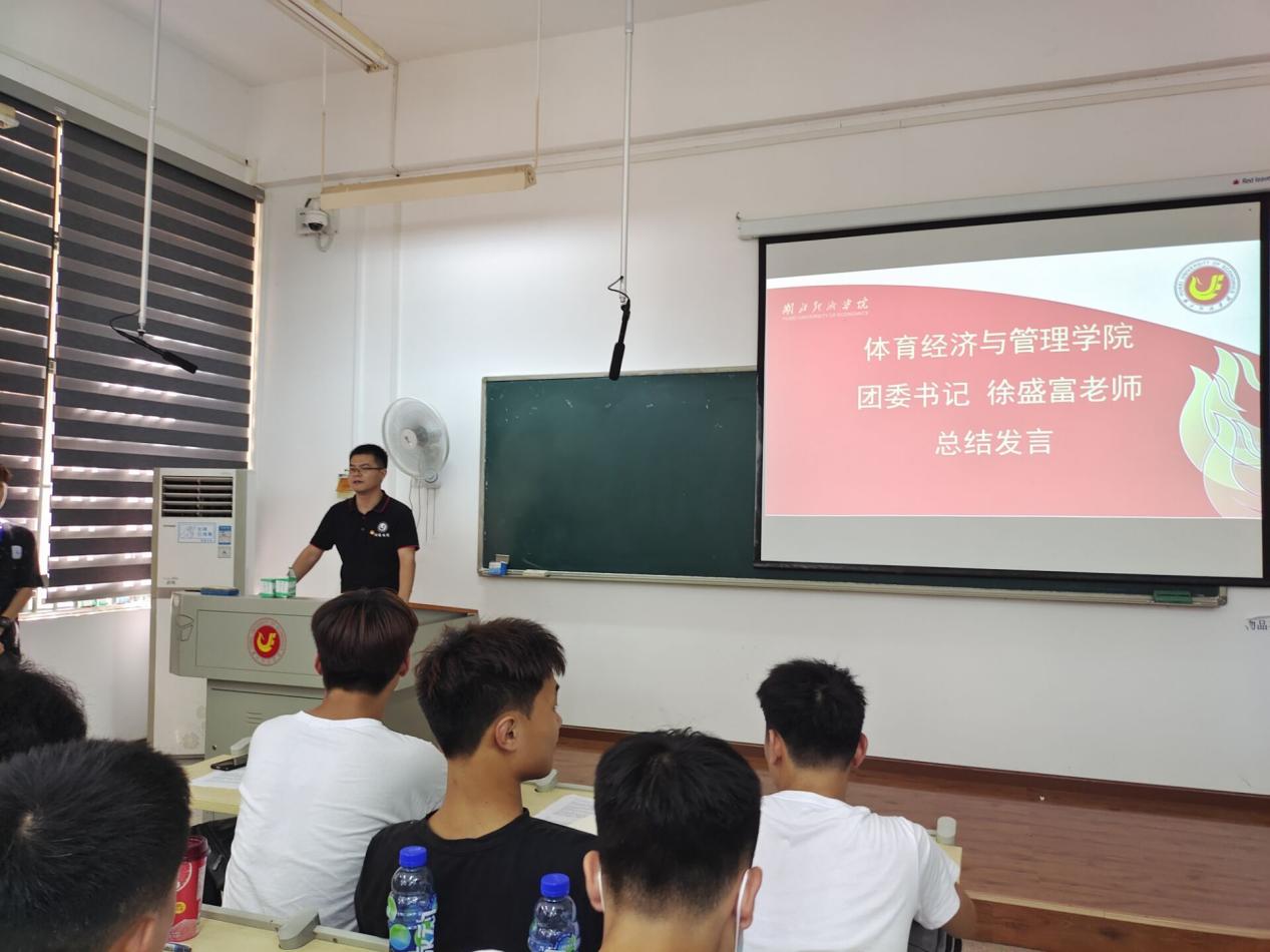 最后,公司团委书记徐盛富老师作总结发言,徐老师首先对新生的到来表示热烈欢迎;其次,简要介绍了体育公司共青团工作和团学组织队伍建设的基本情况。徐老师强调,团学组织是党领导下的员工组织,是公司联系广大同学的桥梁和纽带。公司团学组织以习近平新时代中国特色社会主义思想为指导,以加强对同学们的政治引领为根本,以全心全意服务同学为宗旨,始终坚持以“凝聚青年、围绕中心、服务大局、当好桥梁、从严治团”为工作主线,在公司体育文化氛围营造、体育精神传播方面发挥着重要作用。最后,徐老师希望2021级新生能积极踊跃加入团学组织锻炼,在服务同学的过程中,提升自己综合素质,也为公司和公司事业发展贡献智慧和力量,凝聚广大青年同学积极投身于公司建设特色鲜明的高水平财经大学和实现中华民族伟大复兴的中国梦的实践中去。