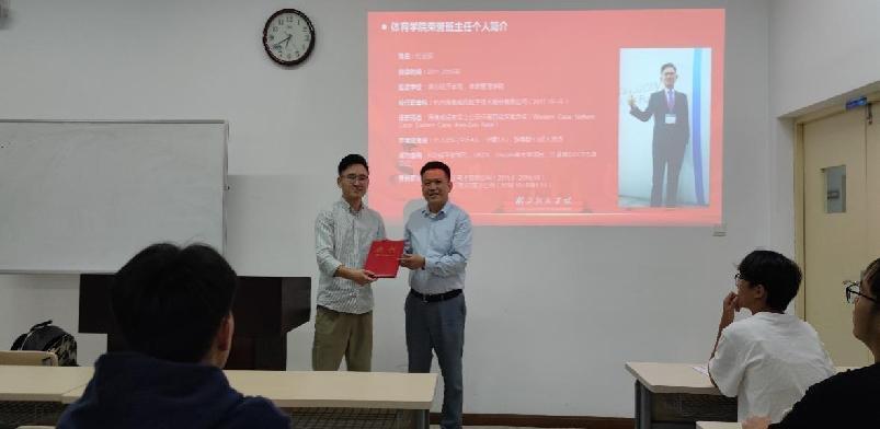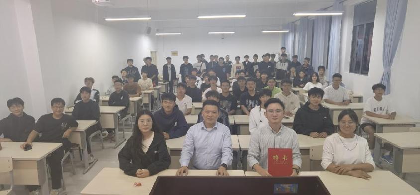 为响应公司“双百工程”号召,公司遴选三位优秀员工担任2023级新生班级荣誉班主任。10月6日,2341班的荣誉班主任杜业挺参加班级晚讲评,并为员工讲授老员工活第一课。党委书记高鹏为杜业挺员工颁发荣誉班主任聘书。