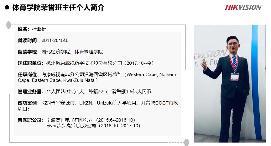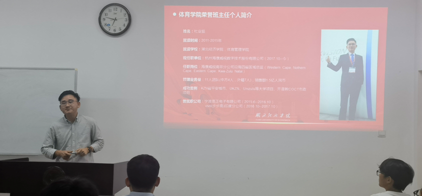 杜业挺员工感谢公司和公司的信任,表示将积极配合公司做好班级相关工作。授课中,杜业挺员工首先介绍了2015年毕业后自己的职业轨迹,与大家分享了大学四年生活的收获与感悟,他希望新生同学们进入大学伊始要合理制定四年学习目标,了解就业目标企业对人才需求的标准。他建议同学们,一是审视自我。看清自己、平视家庭、剖析人生,在分析自身优劣的基础上做出选择,很多时候选择大于努力。二要练就硬、软两项技能。硬技能包括做成一项工作所需要的特定知识和能力;而软技能则包括人际关系等,杜老师指出体育生在交流上目前存在的共同特点是“私下交流多,上台演讲差”,鼓励大家多锻炼演讲能力。三是积极参与社会实践。他认为“社会是利益的交集”,要识别判断好这样的关系,建议同学们多到休闲体育专业与高端市场联系更多经济发达城市看看,把握高端服务业发展态势,细致观察所处时代的大环境。