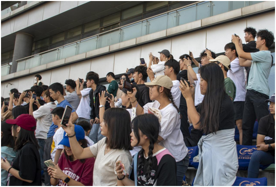 师生到达武汉东方马城国际赛马场时,不禁被2023年武汉东方马城20周年庆典活动现场所吸引,纷纷结合自己在课堂学习的专业知识,打开了手机,利用各种小程序、公众号推文去充分地了解武汉赛马运动历史、赛马文化传承以及赛马产业发展等,沉浸式参与现场活动。