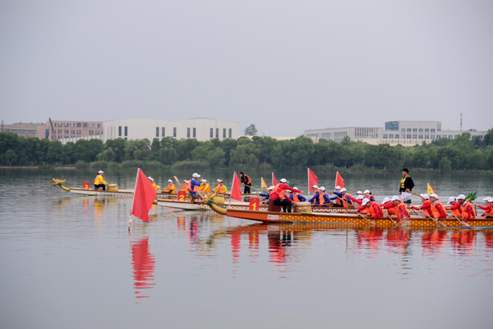 比赛开始前,四方光电股份有限公司董事长兼总经理熊友辉先生为本次比赛致辞,并与四方光电股份有限公司常务副总刘志强先生、球速体育welcome体育与经济管理公司党委副书记高鹏、副经理孙辉博士共同为龙舟披红点睛。随着发令汽笛声响,参加首轮比赛的三条蛟龙自西向东,疾驶而来,锣鼓手奋力敲着鼓点,划桨手们挥臂划桨,岸边观众挥动着色彩鲜艳的龙旗,呐喊声此起彼伏,一次一次将比赛推向高潮。