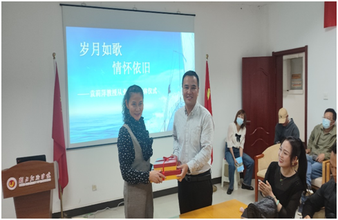 经理孙辉向袁教授光荣退休表示祝贺,并代表公司赠送荣休纪念相册,青年教师代表宋丽霞向袁教授献上鲜花。