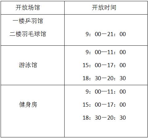 为满足在校师生锻炼身体需要,“五一”期间(429日至53日)乒羽馆、游泳馆以及健身房正常运营,其中游泳馆、健身房增加上午场。请进馆师生持本人有效健身卡或购票入场,服从工作人员管理。具体时间如下: